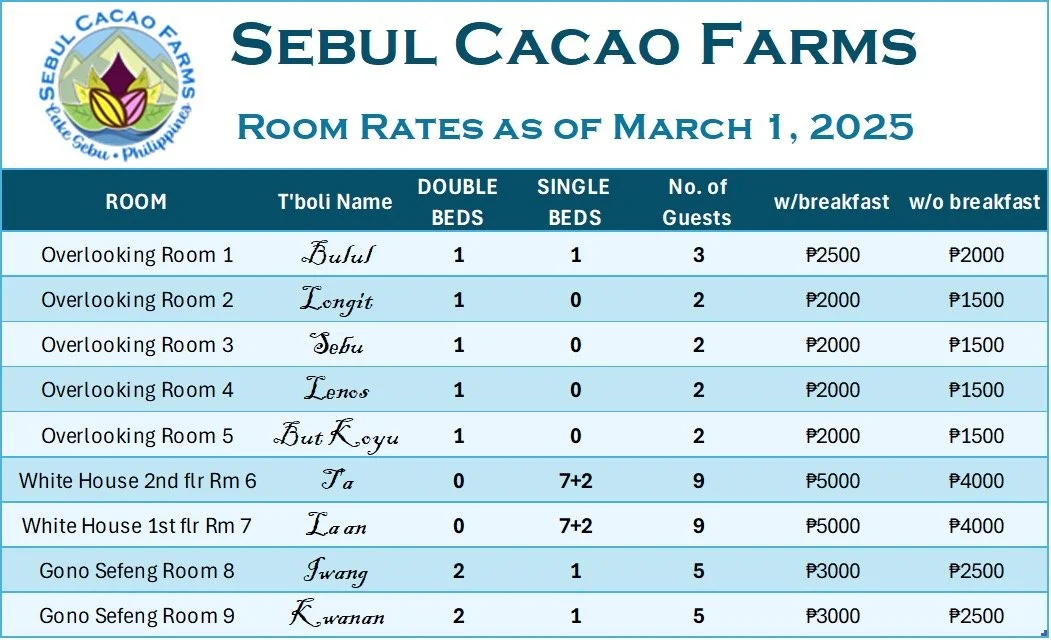 The resort boasts of elegantly designed accommodations, ranging from double occupant rooms to family accommodations, each thoughtfully designed to provide comfort and relaxation. Guests wake up to stunning views of the lush greenery of our cacao trees and the calm waters of Lake Sebu, creating an ambiance of serenity and tranquility. With a dedication to sustainable practices, the resort harmoniously integrates into its natural surroundings, offering a range of eco-friendly activities and experiences. Visitors can explore the verdant surroundings through guided nature walks, embark on invigorating hikes, or partake in cultural immersions to discover the local traditions and heritage of the T'boli community.